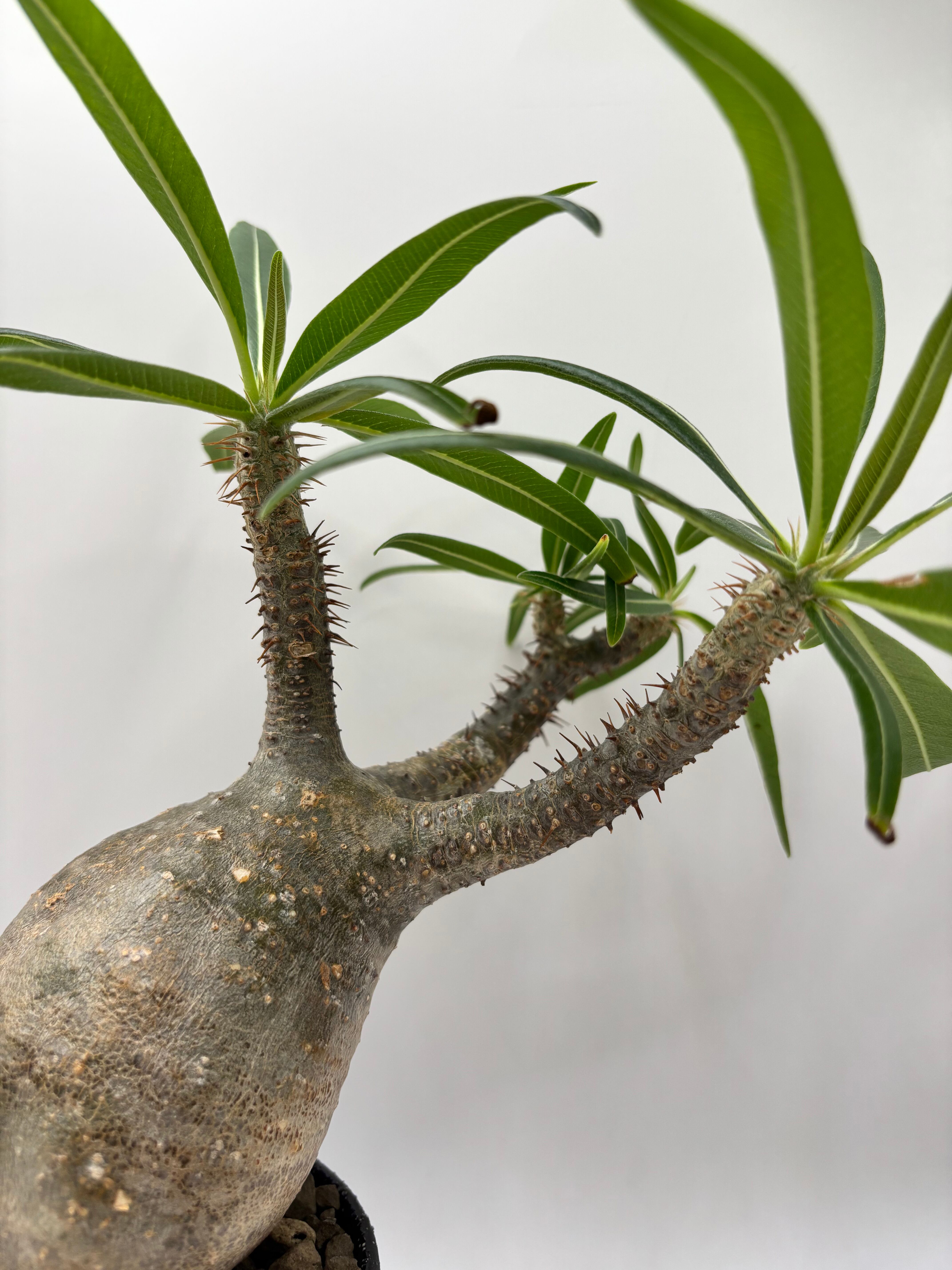 パキポディウム グラキリスは明るい場所を好むため、直射日光を避けることが重要です。水やりは土の表面が乾いたタイミングで行い、過湿には十分に注意してください。また、寒さには敏感ですので、冬期は暖かい場所での管理をおすすめいたします。