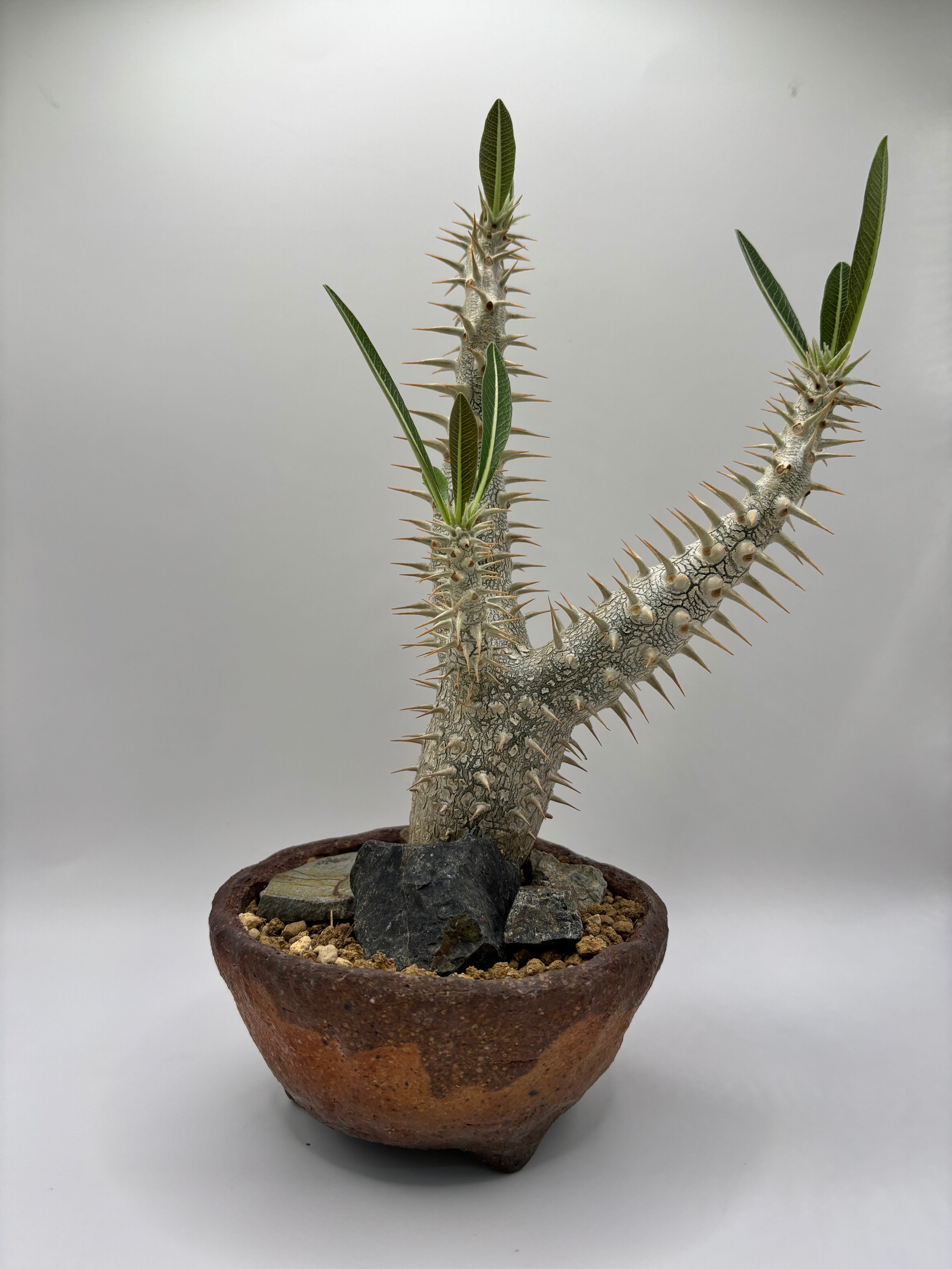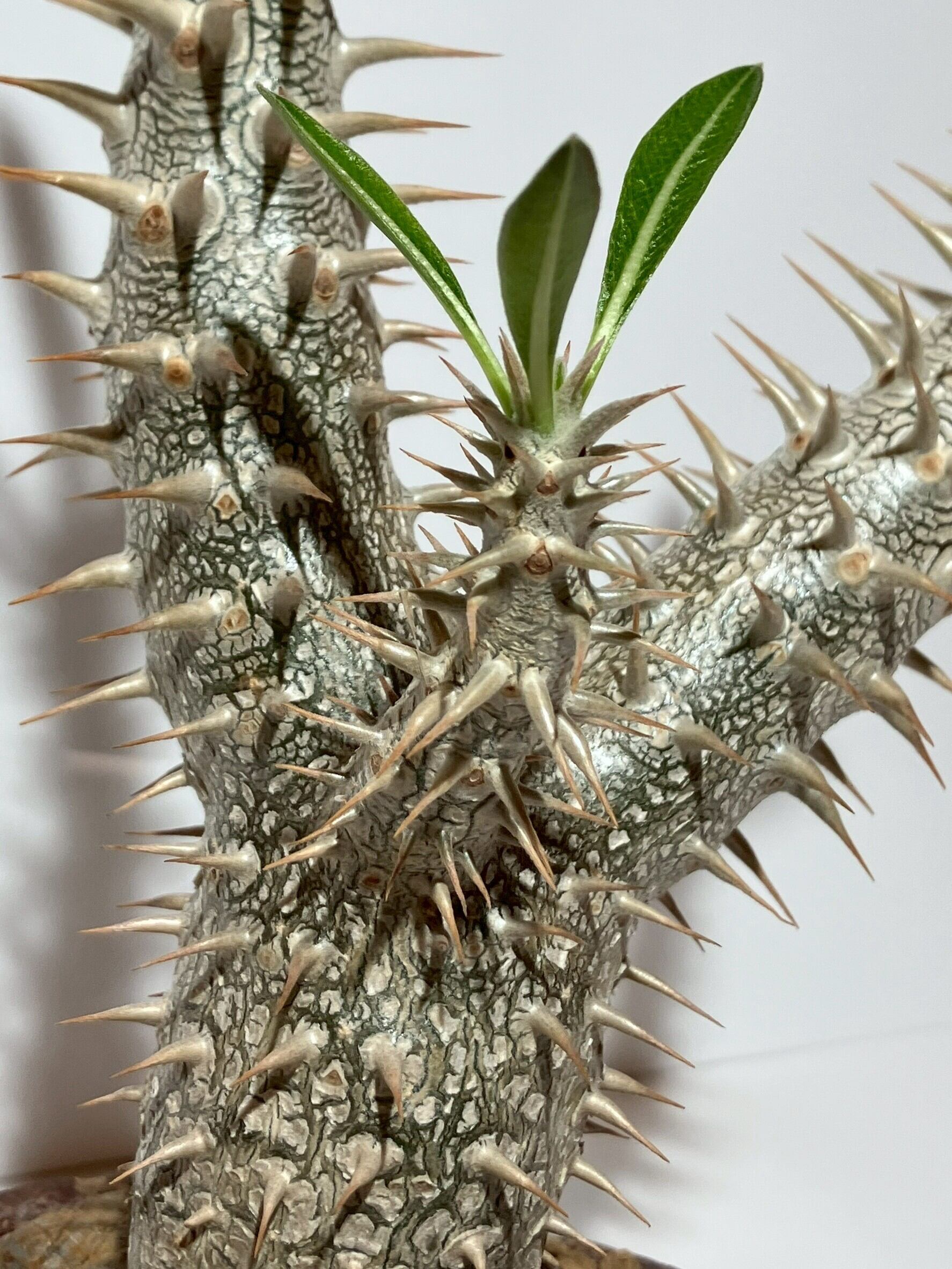 その独特な形状と美しい葉色が魅力のパキポディウム デンシフローラム。この植物は、インテリアにエレガントさを添え、心を豊かにする空間を演出します。現地で発根したこの植物は育てやすく、初心者の方でも安心して楽しめる観葉植物です!